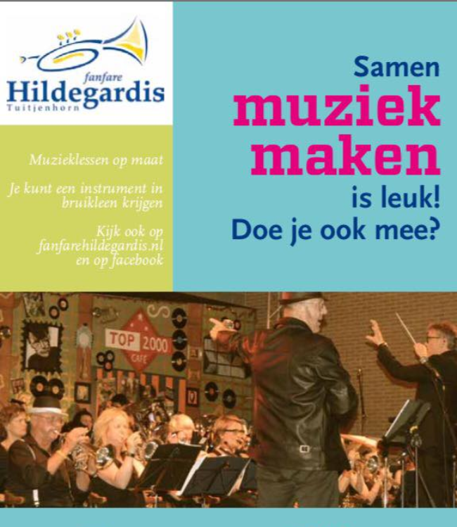 Bijna iedereen in Tuitjenhorn en omstreken kent fanfare Hildegardis. Je ziet de fanfare o.a. op Koningsdag, bij de intocht van Sinterklaas en in de kerk tijdens bijvoorbeeld oudejaarsavond. Misschien heb je de fanfare ook wel eens gezien tijdens een concert of een ander evenement.